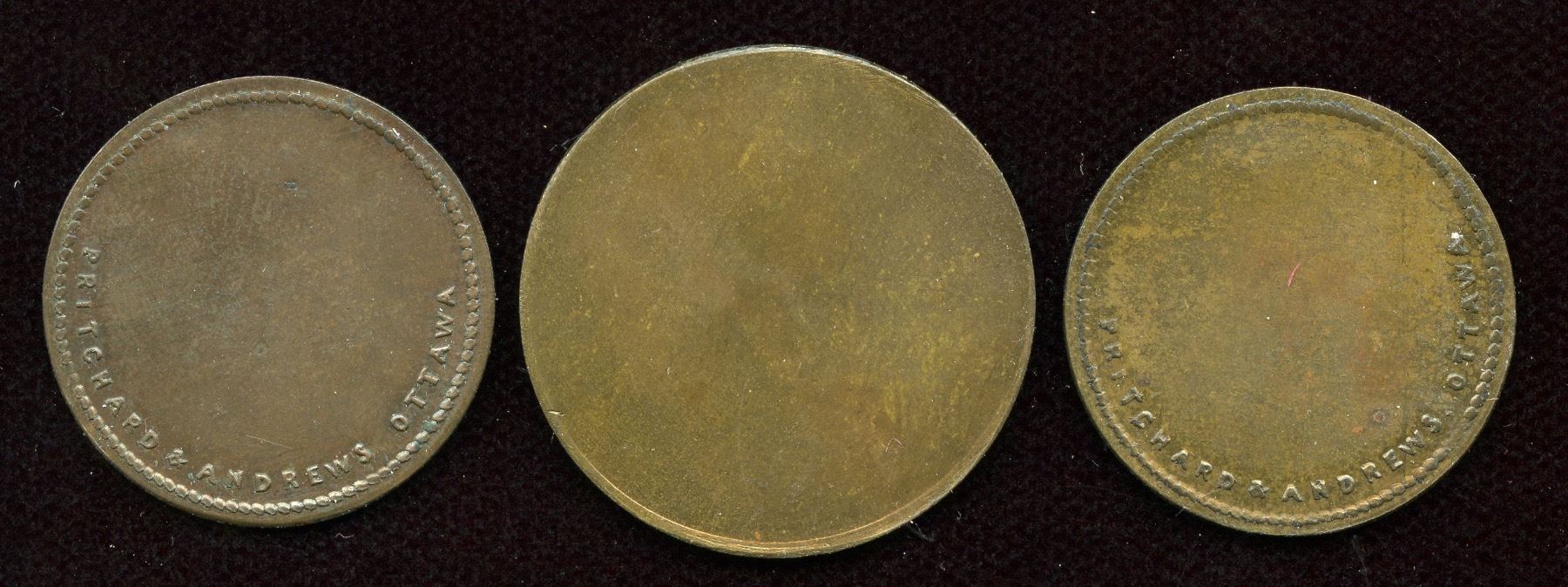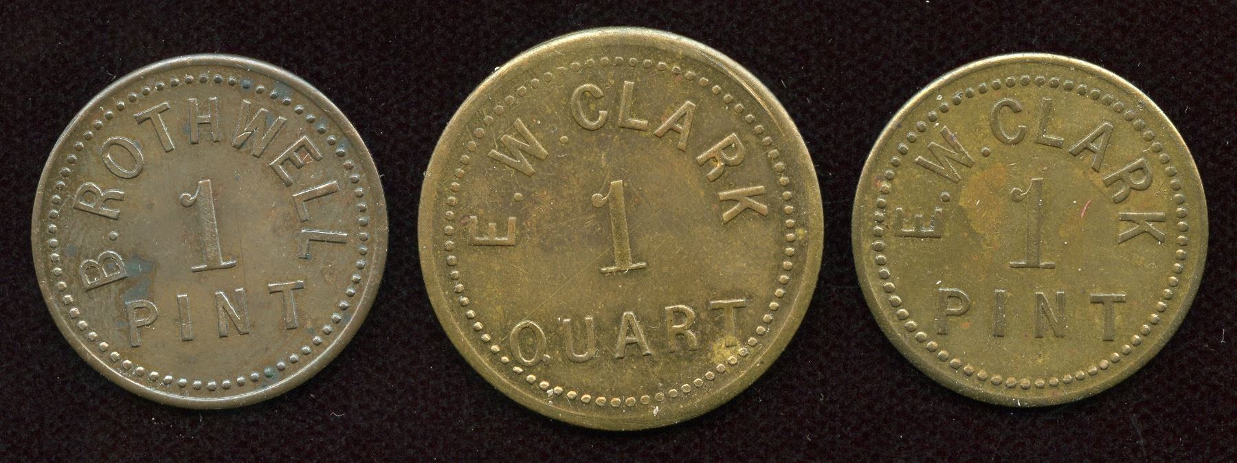 Br. 821, B. Rothwell, 1 Pint, Copper, VF; Br. 822, E.W. Clark, 1 Quart, Brass, EF; Br. 823, E.W. Clark, 1 Pint, Brass, EF. 3 Pcs.