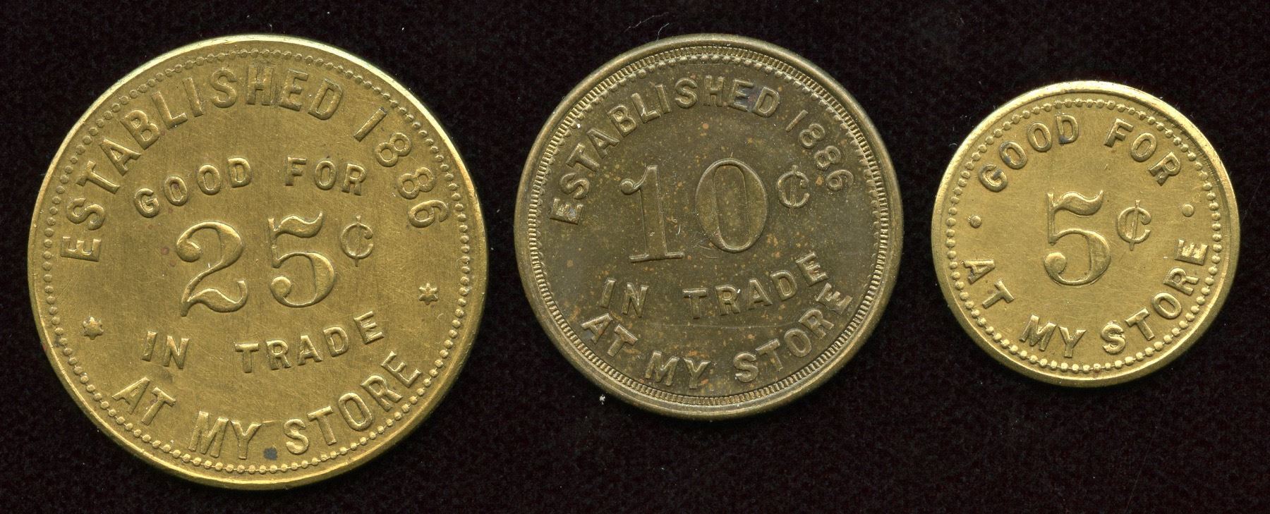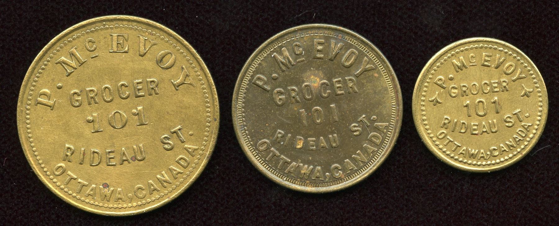 Br. 831, P. McEvoy, 25c, Brass, EF; Br. 832, P. McEvoy, 10c, Brass, EF; Br. 833, P. McEvoy, 5c, Brass, EF. 3 Pcs.