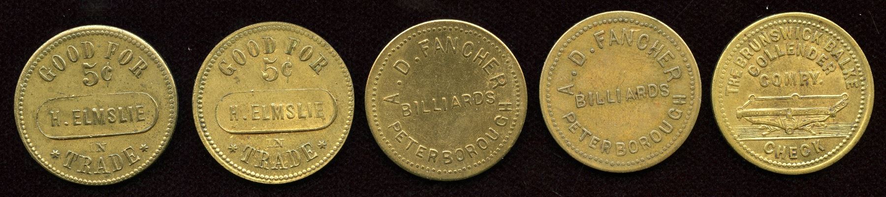 Br. 752, H. Elmslie, 5c, Brunswick Balke Collender, Brass, EF; Same as previous; Br. 753, A.D. Fancher, 5c, Brass, EF; Same as previous; Br. 754, G.A. Graham, 5c, Brunswick Balke Collender, Brass, EF. 5 Pcs.