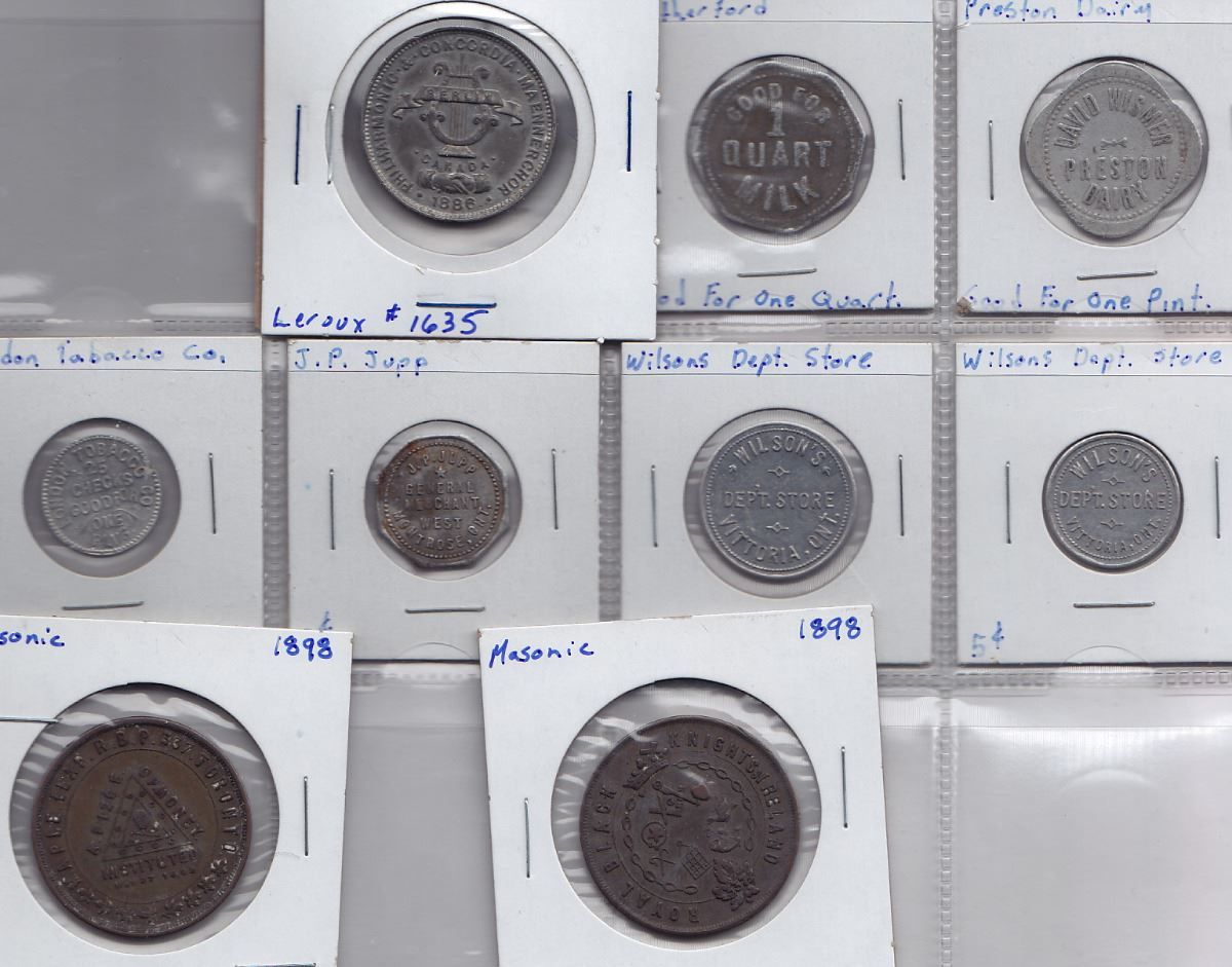 Ontario Tokens - Lot of 9 - Ler 1635, 1886 Berlin Saengerfest, WM, EF; R.G. Rutherford, Havelock, 1 Quart; David Wismer, Preston, 1 Pint; Mc 772 London Tobacco Co., London; Bo 1140-B-E, J.P. Jupp West Montrose 5c; Wilson's Vittoria 10c and 5c; (2) Royal Black Knights Toronto. F-VF. 9 Pcs.