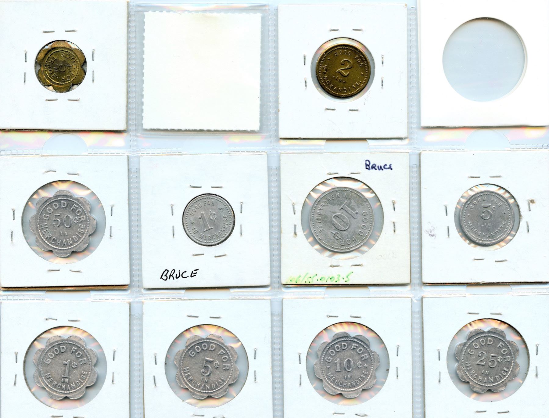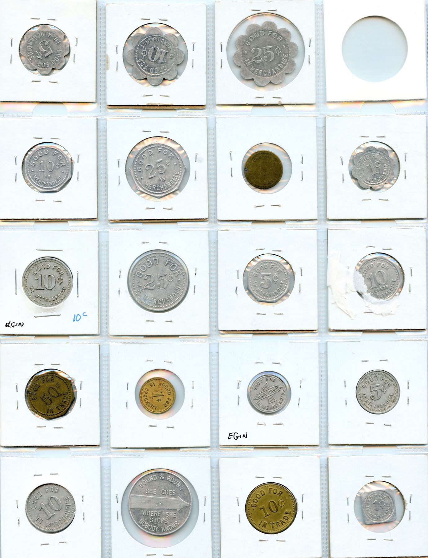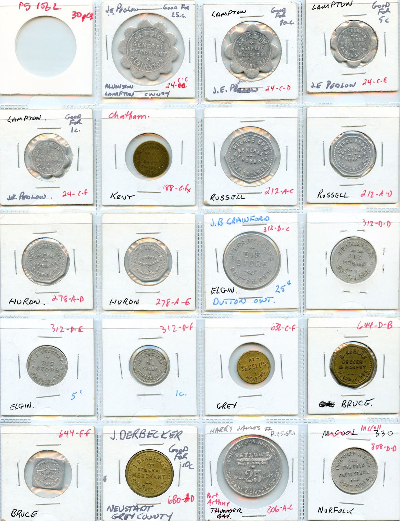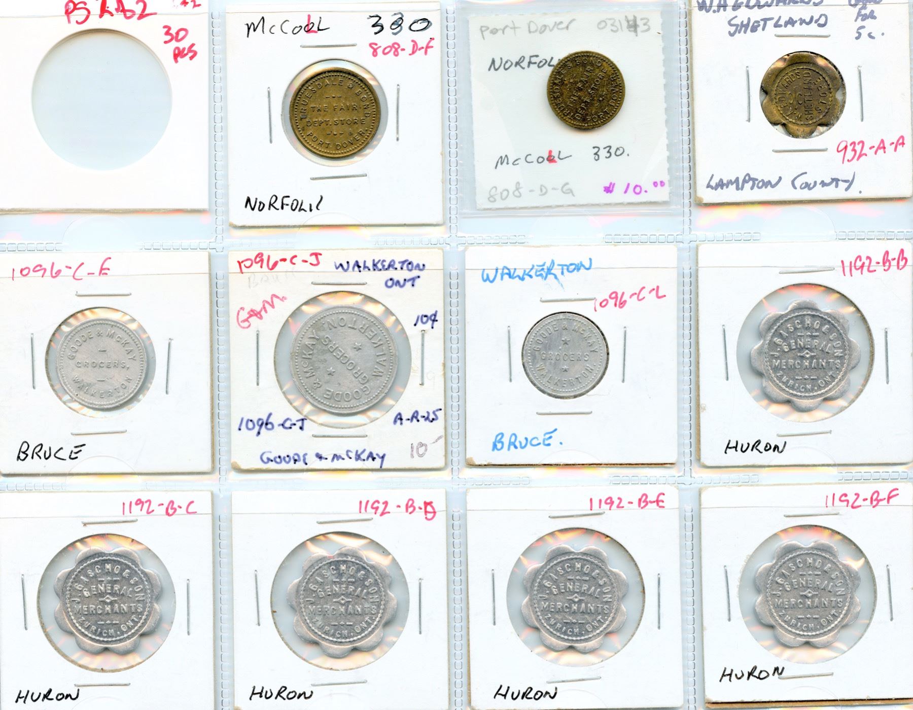 Lot of 30 tokens. Includes: Bo 24-C-C to C-F J.E. Pedlow, Alvinston, Rev: 25 to 1c; 188-C-Fx, Canada Business College, Chatham, Rev: 1c; Bo 212-A-C and A-D, Pierce Bros., Clear Creek, Rev: 25c and 10c; Bo 278-A-D and A-E, Tieman & Edighoffer, Dashwood, Rev: 10c and 5c; Bo 398-D-C to D-F, J.B. Crawford, Dutton, Rev: 25c to 1c; Bo 632-C-F, Sewell's, Meaford, Rev: 1c; 644-D-B, H. Keelan, Mildmay, Rev: 50c; Bo 644-F-F, Star Grocery, Mildmay, Rev: 1c; Bo 680-A-D, J. Derbecker, Neustadt, Rev: 10c; Bo 806-A-C, Taylor's, Port Arthur, 25c, (spinner); Bo 808-D-D, D-F and D-G,Tuesdale & Bond, Port Dover, Rev: 10, 2 and 1; Bo 932-A-A, W.A. Edwards, Shetland, Rev: 5c; Bo 1096-C-E, C-J and C-L, Goode & McKay, Walkerton, Rev: 5c, 10c and 1c; Bo 1192-B-B to B-F, J. Gascho, Zurich, 50c to 1c. G to EF. 30 Pcs.