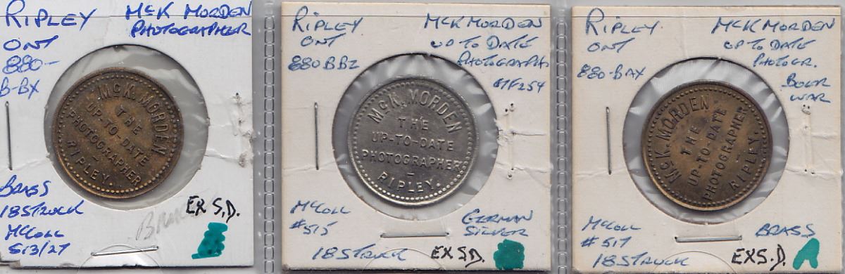 Includes: Mc 513 18 struck Mc K.Morden Ripley Rev: 25c on a doz; Mc 515 18 struck as as previous; Mc 517 18 struck Mc Morden Rev: Clasped hands. EF. 3 Pcs.
