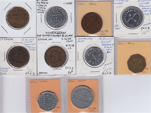 Includes: Ler 1072t, As 1270a, Victoria Bakery/ Slinn Brothers 1 loaf, brass; Ler 1072u, Mc 1020a, AS 1260j, Victoria Bakery/ B. Slinn 1 Loaf, Al.; As 1260k, same, brass; As 1260h, O’Connor St./ B. Slinn, 1 loaf, ,Al.; AS 1260i, same, brass; As 1265b, East End Bakery, S. Slinn, 1, incuse, brass; As 1260e, 549 Bank St., ½ Loaf, Al., octagonal; As 1260c, O’Connor St., ½ Loaf, octagonal, brass; As 1945a, b, W.G. Graham Westboro, 1 loaf, Al.; ½ Loaf, Al. VF to BU. 10 Pcs.