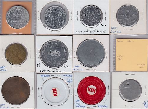Includes: Bo 760-AD-A, Lindsay Pianos; Bo 760-B-A, Bell Piano; Mc 790, Jarvis Studio, 50 cents, Al.; Mc 123, Bo 760-BD, E, EX, Stroud’s; Ler 996x, Stonhouse & Chamberlain; Shepard & Morse Lumber, al; Mason, Gordon & Co. (lumber), Al., brass; Kinsman Drink Token, white plastic, red plastic; R[ideau]. B[owling]. C[lub]. white metal. 12 Pcs.