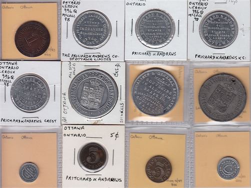Includes: Pritchard & Andrews 1, copper; Ler 996q, Mc 98, Engravers Scale Makers, w. coat of arms rev., Al.; Engravers, w. coat of arms rev., Al.; Engravers, w. Business Checks rev., Al.; Business Checks, w. coat of arms rev., Al.; Pritchard-Andrews Company, w. Brass Lecterns rev., Al. (holed at top); Pritchard-Andrews Company, w. Medals and Souvenirs rev., Al.; Pritchard-Andrews Company, w. Medals and Souvenirs rev., white metal (holed); Scale Makers and Engravers, w. lion and unicorn rev., Al.; 5¢ In Trade, brass; Good For 5¢ In Trade, brass; Ye Have Done It Unto Me, heart, Al. EF-Unc. 12 Pcs.