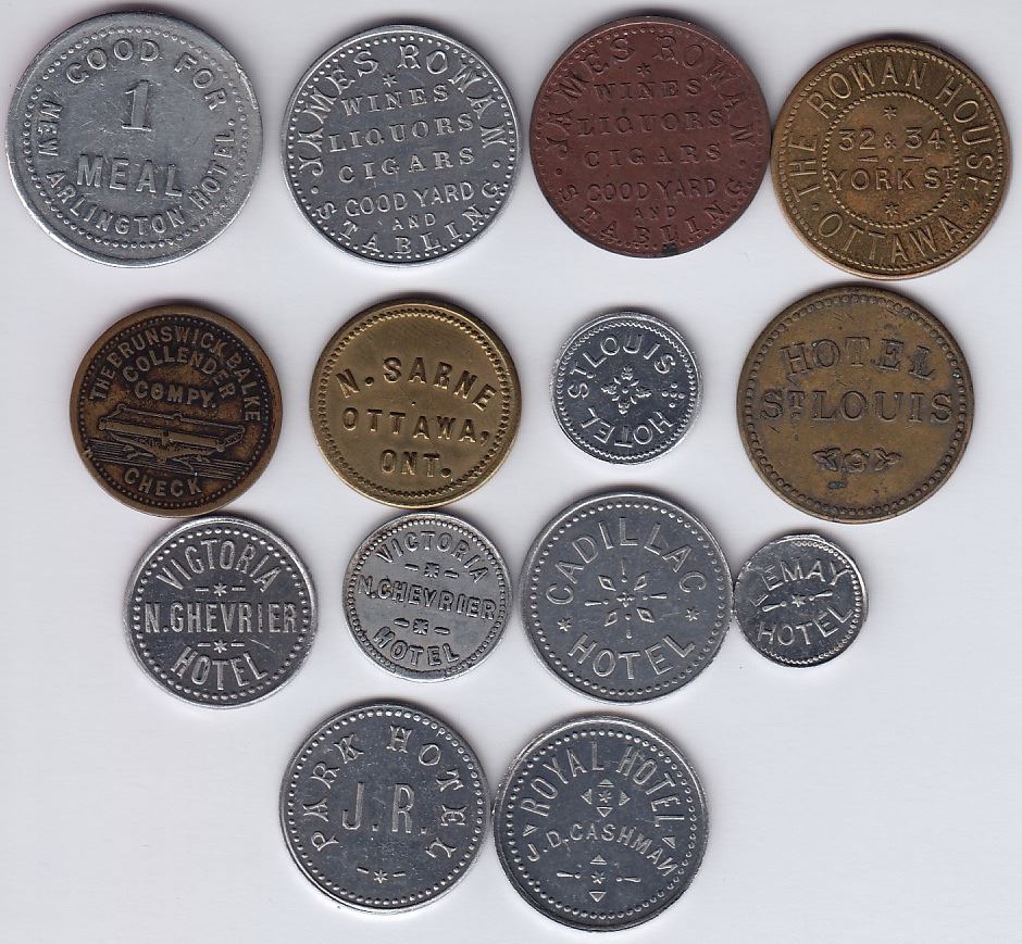 Includes: Bo 760-AJ-C, New Arlington/25; Bo 760-AX-A (Leroux 1072l), same in copper, 760-AX-B (Leroux 1072m), Rowan House; Bo 760-AY-E, W. Rowe (scarce); Bo. 760-AZ-E, N. Sarne; Bo. 760-BC-E, H, Hotel St. Louis; Bo 760-BY-D, E, Victoria Hotel; Bo 760-CL-E, Cadillac Hotel; Bo 760-CH-E, Lemay Hotel; Bo 760-CM-E, Park Hotel; Bo 760-CN-E, Royal Hotel. VF to Unc. 14 Pcs.