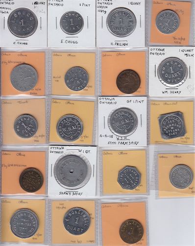 Includes: Mc 1162a, E. Chugg, 1 quart, Al.; E. Chugg, 1 pint, al; Ler 1069g H. Philion, 1 quart, Al.; Ler 1069q, H. Philion, 1 pint, Al.; Mc 1191, W.J. Fenton, 1 quart, Al.; 1 pint, Al.; W.J. Fenton, 1 pint, brass; Mc 1165 Wm. Henry, 1 quart, Al.; Wm. Henry, 1 pint, Al.; Echo Farm Dairy, P & A rev., Al.; Echo Farm Dairy, 1 pint, Al.; E.D. Leclerc, 1 pint, Al.; R. Hopkins, 1 pint, br.; Shaws Dairy, 1 qt., Al.; Ottawa Dairy 3, Al.; Ottawa Dairy 5, Al.; Ottawa Dairy 10, Al.; Mc 1162, E. Honeywell, 1 quart, Al.; E. Honeywell, 1 pint, brass. Mostly Unc. 19 Pcs.