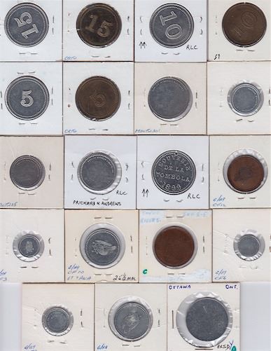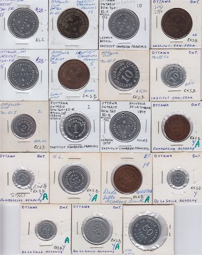 Includes: Commercial Academy, One Cent, 1913, copper; 5 cents, Al.; 25 cents, Al.; De La Salle Academy, One Cent, copper (cleaned); 5, 10, 25, and 50 cents, Al.; Bo 760-BI-E, Ex, F, Fx, G, Gx, Al. and brass; 760-BJ-F, Fx, J, K, Al., Institut Canadien Français; Bo 760-BI-J, Souvenir de la tombola, Al. (holed). 19 Pcs.