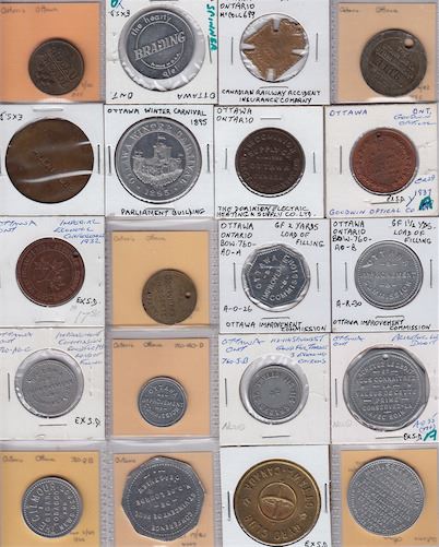 Includes: Rideau Arcade, brass; Brading Ale, Al.; Canadian Railway Accident Ins. Co., brass; Ottawa Gas Co., white metal; Rideau Club, brass; Ottawa Winter Carnival 1895, Al.; Dominion Supply Co., brass; Goodwin Optical Royal Visit, copper; Imperial Economic Conference, 1932, copper (holed); Consumers Electric, brass (holed); Bo 760-AO-A, B, C, D, Ottawa Improvement Commission; Mc 792, Bo 760-J-B, Three Evening Citizens, newspaper, Al.; Achetez Le Droit, newspaper, Al.; Bo 760-Q-B, Gilmour Cigar Store; Conference St. Vincent de Paul, $1.00, Al.; Gyro Club, brass; Morissett & Lemieux, Al. Most are Unc. 20 Pcs.
