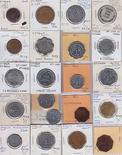 Includes: As 1225b, c, Union Bakery, D. Lee, ½, incuse, copper; Union Bakery, D. Lee, 1 incuse, brass; As 1240b, Morrison-Lamothe, Good For One Loaf, celluloid, EF; As 1240a, Morrison-Lamothe, Good For One :Loaf, white metal, VF; As 1235a, F.H. Martelock, ½ Loaf, incuse, brass; As 1245a, Charles Pearce, 1 Loaf of bread, Al.; As 1210a, Greer`s Bakery, 1 Loaf, Al.; As 1275a, A. Sugarman, 1 Loaf of Bread, Al.; As 1185b, J.S. Balharrie, 1 Loaf of bread, Al.; As 1220b, Charles Ledword, 1 Loaf, Al.; As 1255a, b, Aug. Roy, ½ Loaf, Al.; Aug. Roy, 1 Loaf, Al.; As 1455b [for Port Hope], J. Broadbent, 1 Loaf, Al., EF; As 1190a, b, c, d, e, f, J. Cunningham, ½ Loaf, Al.; J. Cunningham, ½ Loaf, copper; J. Cunningham, ½ Loaf, brass; J. Cunningham, 1 Loaf, Al.; J. Cunningham, 1 Loaf, copper; J. Cunningham, 1 Loaf, brass; As 1195b, M. Cunningham, 1 Loaf, Al. Most are Unc. 21 Pcs.