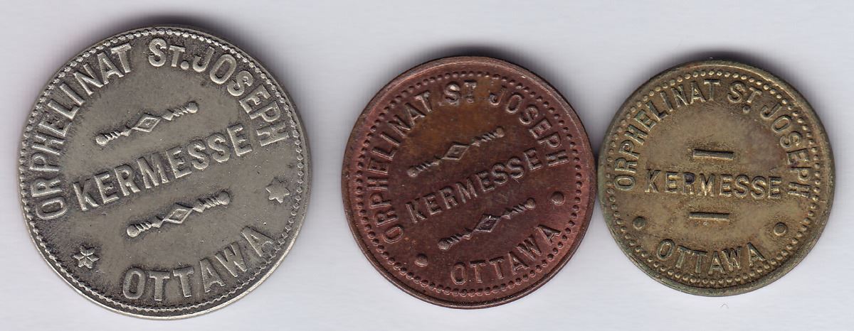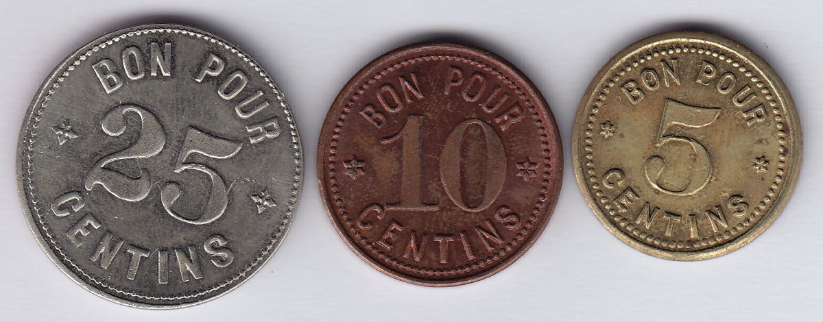 Includes: Breton 799, Orphelinat St. Joseph, 25 centins, white metal; Breton 800, 10 centins, copper; Breton 801, 5 centins, brass. Unc. 3 Pcs.