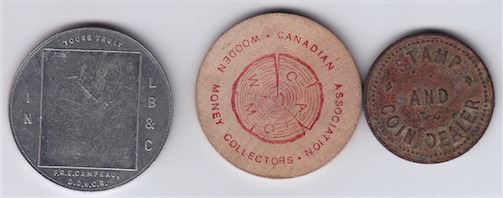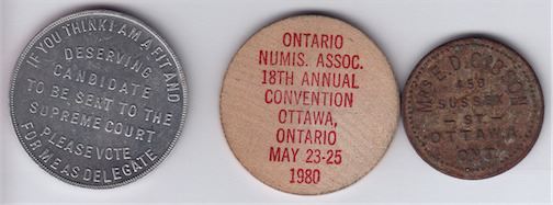 Includes: Mrs. E.D. Gibson, Stamp and Coin Dealer, brass, VF, some dirt; F.R.E. Campeau, campaign for the Supreme Court, Al., Au, lacks the paste on photo; Ontario Numismatic Association, 15th Convention wood, 1980, EF. 3 Pcs.