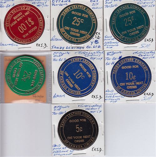 Includes: Bo 760-BE-A, $1.00, red, BE-C, 25 cents, blue, BE-G, 25 cents, blue, different rev., BE-G, 25 cents, green; BE-D, ten cents, blue; BE-H, ten cents, blue, different rev.; BE-I, 5 cents, blue. All Unc. 7 Pcs.