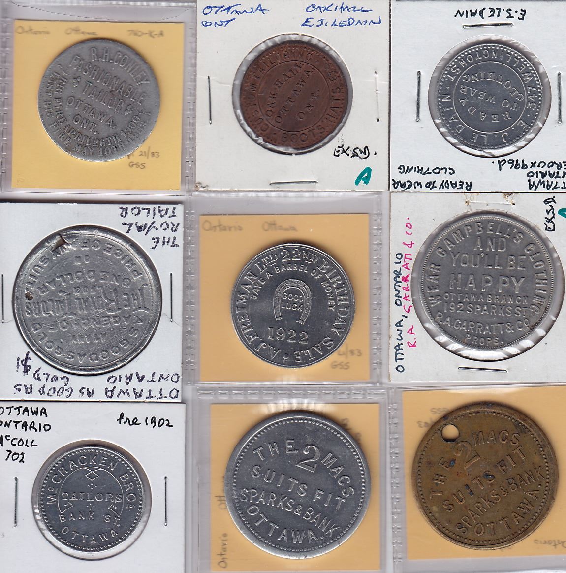 Includes: Bo 760-K-A, R.H. Conley, Fine; R.A. Garrett & Co. 1903, Al., Unc; A.J. Freiman Good luck, 1922, Al., BU; Mc 702, McCracken Bros., Al., BU; The 2 Macs, Al., Unc, and brass, VF (holed); E.J. Le Dain, Al. (Mc 794) and copper, both Unc; Royal Tailors, Al., poor, holed. 9 Pcs.