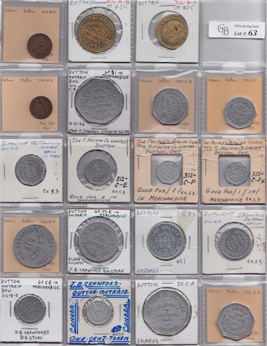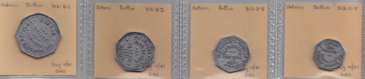 Includes: Bo 312-A-B, A-C, A-E, A-F Drake & Mc Pherson Dutton Rev: 50, 25, 5 and 1; Bo 312-C-A to C-F, C-Fx The T. Hockin Co. Rev: 1.oo, 50, 25, 10, 5, 1 and 1; Bo 312-D-A to D-F J.B. Crawford's Rev: $1, 50c 25c, 10c, 5c and 1c; Bo 312-E-A to E-F Thos. Hockin Rev: 1.oo, 50, 25, 10, 5 and 1. F to EF. 23 Pcs.