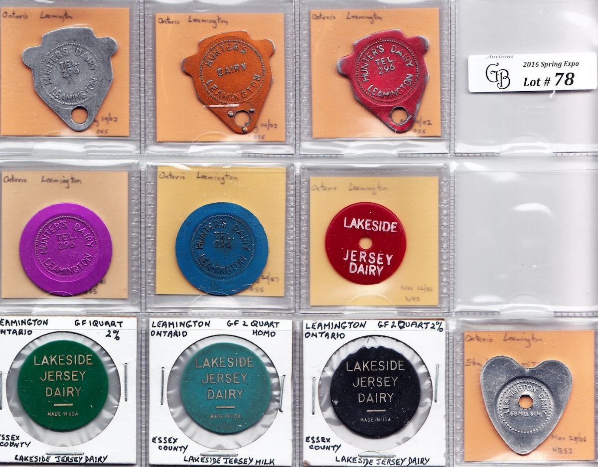 Includes: Hunters Dairy (gold) 1 quart 2% A.J. milk; (alum) 1 quart; non1fat quart; (purple) twin-pak homo; (blue) twin-pak 2%; Lakeside Jersey Dairy (red) 1 quart; (green) 1 quart 2%; (light blue) 2 quart homo; (black) 2 quart 2%; Leamington Dairy (alum) 1 quart centre holed. F to EF. 10 Pcs.