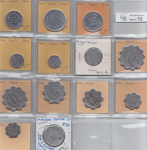 Includes: Bo 556-B-A to B-E M.G. Brethour Rev: $1, 50c, 25c, 10c and 5c; C.W. Hendershot Co. Rev: 10c; T. Salmoni Rev: $1, 50c, 25c, 10c, 5c and 1c; Imperial Canning Co. 23. F to EF. 13 Pcs.