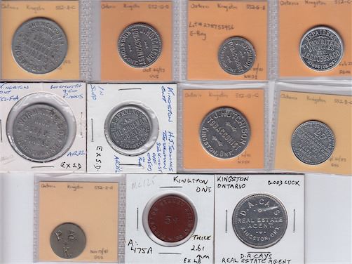 Includes: Bo 552-A-C, Abramson, Al., aVF; Bo Supp, H.J. Jennings, 5cts., Al., Unc; Bo 552-G, C, D, E, Hutchison, Al., all Unc; Bo 552-F-A, Wormwith & Co., Al., VF; Bo 552-C-A, Dobbs & Co., Al., BU; Bo 552-D-C, Keeley, Jr., Al., Unc; Bo 552-E-A, P.[hil] B.[ajus], brass, incuse, EF; D.A. Kays, Real Estate, good luck piece, Al., BU; At 475A, Mc 125, Kingston Street Railway, 5¢, celluloid, EF. 11 Pcs.