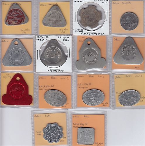 Includes: Cedar Springs Dairy, Merrickville, 1 quart, Al., red, Fine; 1 quart, Al., plain, EF; 1 pint, Al., VF; V. McNaughton, Kemptville, 1 pint, Al., Fine; Kemptville Dairy, 1 quart, top hole, EF; Cardinal Dairy, 1 quart milk, Al., BU; 1 quart milk, bottom hole, Al., Unc; 1 quart of milk, Al., Unc; 1 quart milk, Al., red, BU; E.D. Miller, Picton, one pint, oval, Al., VF+; one pint, oval, different ornaments, Al., EF; one pint, oval, different ornaments, Al., Unc; 1 quart, scalloped, Al. (Mc 1178), Unc; E.D. Miller & Son, ¼ pint, square, Al., EF. 14 Pcs.