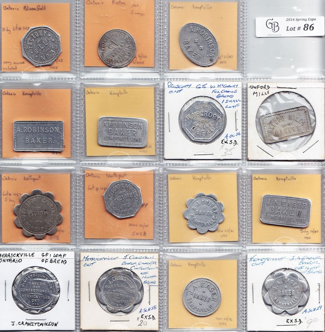 Includes: As 1015a and 1016a, Cranston, Merrickville, 1 loaf, Al., BU; different alignment of legend, 1 loaf, Al., EF; As 0780a, b, c, J.A. Eager, Kemptville, 1 loaf, round, Al., VF+; 1 loaf, scalloped, Al., Fine; 1 loaf, rectangle, Al., EF; As 0785a, B.J. Frisby, Kemptville, 1 loaf, Al., Fine; As 0790b, c, d, A Robinson, Kemptville, 1 loaf, oval, Al., Unc; 1 loaf, rectangle, Al., Unc; 1 loaf, rectangle, w. rev. ornaments, Al., VF+; As 1485a, W. McGrory, Prescott, 1 small loaf, Al., EF; As 1300a, Oxford Mills Bakery, 1 loaf, Al., aEF; Northport Canning Factory, 25 pails, Al., EF; Northport Canning Factory, 1 pail, Al., aVF; D.C. Ltd., Picton, Tomatoes, Al., VF; Dominion Canners, Picton, 1 pail, Al., aVF. 15 Pcs.