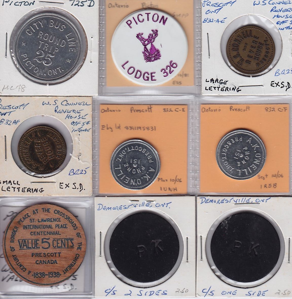 Includes: At 725, City Bus Line, Picton, 25, Al., rare, BU; Bo Supp, Picton Lodge 326, one drink, white plastic, Unc; Bo 832-A-E, F, Connell, Prescott, brass, 5¢, lg. and sm. lettering, both VF; Bo 832-C-E, F, O’Neill, Prescott, Al., both BU; Peace Centennial wood, Prescott, 5¢, Unc; PK cmkd. both sides copper disc, Demorestville; PK cmkd. one side copper disc, Demorestville. 9 Pcs.