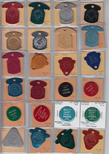 Includes: Bancroft Dairy, 1 quart milk, Al., red, EF; 1 Homo quart, Al., green, EF; 1 Homo quart, Al., green, EF; 1 quart skim, Al., plain, EF; 1 2% quart, Al., gold, AU; 1 quart skim, diff. style, Al., plain, BU; Reid’s Dairy, Belleville, 3 quart jug skim, Al., gold, AU; 3 quart jug 2%, Al., blue, EF; 3 quart jug Homo, Al., red, EF; 1 quart skim, Al., gold, Unc; 1 Reg. or Homo quart, Al., red, AU; 1 Reg. or Homo quart, Al., blue, EF; ½ gallon 2%, Al., blue, AU; ½ gallon Homo, Al., red, Unc; Madoc Dairy, 1 quart skim, black plastic, VF; 1 quart, red plastic, VF+; 1 pint, green plastic, aEF; Marmora Dairy, 1 quart, red plastic, EF; Neal’s Dairy, Marmora, 1 quart, blue plastic, Unc; 1 quart, green plastic, EF; Stirling Dairy, 1 quart, Al., plain, EF; Riverside Dairy, Trenton, 1 Jersey or Guernsey quart, Al., orange, Unc; 1 non fat quart, Al., green, AU; 1 Homo quart, Al., blue, Unc. 24 Pcs.