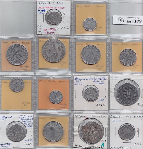 Includes: Bo 800-B-E B.W. Moore Rev: 1c; Bo 800-E-F C. Umphrey Rev:1c; Bo 800-G-D Wm. B. Jackson Rev: 10c; Bo 800-H-B A. Scarsbrook Rev: 50c; as previous Rev: $1, 25c, 10c, 1c and 1c; R. Stirrett Rev: 1c; F.J. Wood Rev: 50c and 10c; Marks the Tailor 1908; Detroit United Railways Rev: Geo. Henderson Petrolea Ont. G to VF. 14 Pcs.