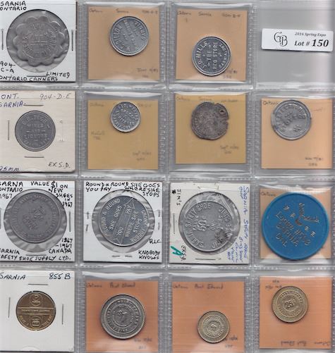 Includes: Bo 804-A-E W.C. DillionRev: 5c ale bottle; Bo 904-B-F J.D. Mills Rev: 1c; Bo 904-C-A Ontario Canners Rev: this check cashed etc; Bo 904-D-E C.H. Pugh 5c ale bottle; Bo 904-E-F Geo. Wemino Rev: 1c; D. Donaldson Rev: 5 in 1982 suppl; Perfection Stove Co. Rev: one cup in suppl; Sarnia Safety Shoe Rev: 1867 1967 spinner in 1982 suppl; Sarnia Safety Shoe Rev: round & round; as previous but different die; Lodge #503; At 855 Downtown Sarnia; three casino tokens. VG to EF. 15 Pcs.