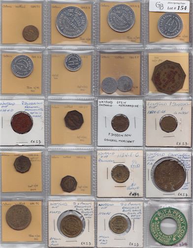 Includes: Bo 1124-A-A to A-Fx Baldwin & Carrothers Rev: $1, 50c, 25c, 10c, 5c, 1c and 1c; Bo 1124-E-A E-D E-F E-G E-Gx P. Dodds Rev: 1.oo, 10, 2, 1 and 1; as previous Rev: 2 different die; as previous Rev: 1 period after Merchandise.; as Bo 1124-E-G c/s VOID on obverse; Bo 1124-F-A F-C to F-F D.G. Parker Rev: $1, 25c, 10c, 5c and 1c; McLaren's Drug Store Rev: put a penny. F to EF. 21 Pcs.