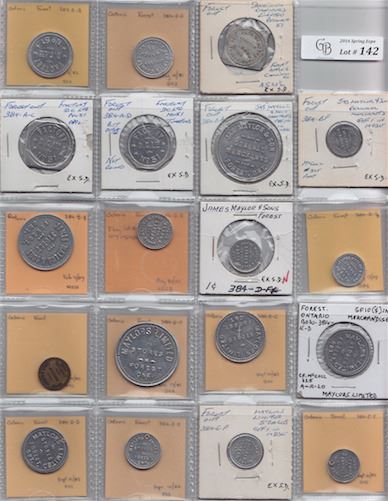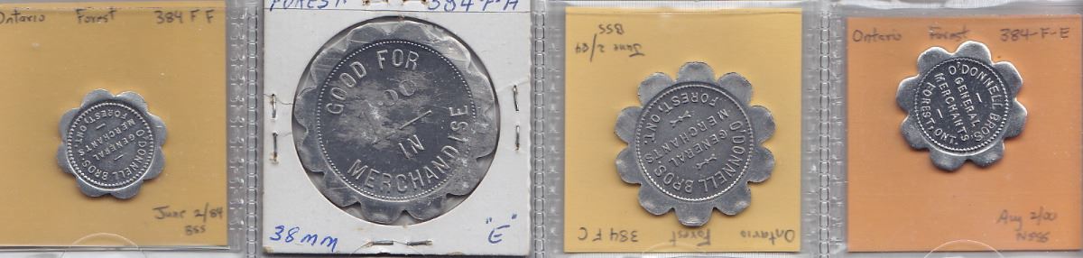 Includes: Bo 384-A-A Dominion Canners Rev: tomatoes; as previous Rev: apples; Bo 384-A-B A-C A-D D.C. ltd Rev: corn, apple and tomatoes; Bo 384-B-A B-F Jas. Maylor Rev: 1.oo and 1; Bo 384-D-B D-E D-F D-Fx Jmes Maylor Rev: 50, 5, 1 and 1; as previous Rev: 2 (brass); Bo 384-E-A E-C E-F Maylors Rev: $1 holed, 25, 10, 10 holed, 5 holed, 1 and 1 holed; Bo 384-F-A F-C F-E F-F O'Donnell Bros. Rev: 1.oo, 25, 5 and 1. F to EF. 23 Pcs.