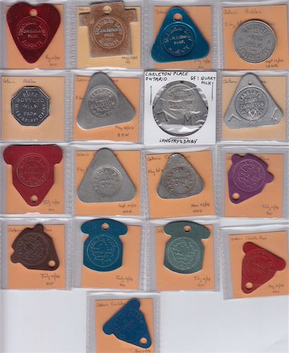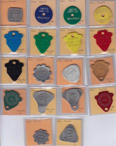 Includes: Smith’s Dairy, Brockville, 1 quart, sq., Al., Unc; 1 quart, blue plastic, c.h.; 1 quart skim, green plastic, c.h.; 1 quart 2 pc, yellow plastic, c.h., Fine; one quart, blue plastic, top hole; one quart skim, green plastic, top hole; one quart 2%, yellow plastic, top hole; 2 quarts milk, red plastic, top hole; 2 quarts 2%, black plastic; Cowan’s Dairy, Brockville, 1 quart, Al., scalloped, VF+; 1 quart, Al., Fine; 2 quart milk, Al., yellow, AU; 2 quart 2%, Al., green, VF+; W.L. Ralph’s Dairy, Brockville, 1 standard quart, Al., EF; 1 standard quart, bottom hole, Al., Unc; 1 quart standard milk, Al., red, bottom hole, AU; Watson’s Dairy, Brockville, 1 quart, Al., EF; 1 pint, EF. 18 Pcs.