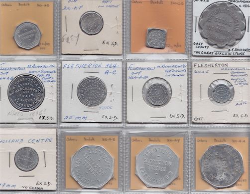 Includes: Bo 300-A-X A-Y A-A A-D A-F R.H. Benson Dundalk Rev: 5.oo, 2.oo, 1.oo, 10, and 1; Bo 300-C-G Ritchie Bros. Dundalk Rev: 1c; J.E. Richards Dundalk Rev: 1.oo; Bo 364-A-B SA-C A-Dx A-E M. Richardson Flesherton Rev: 50 cents, 25 cents, 10 cents and 5 cents; C. Price (no comma) Holland Centre Rev: 1c. F to EF. 12 Pcs.