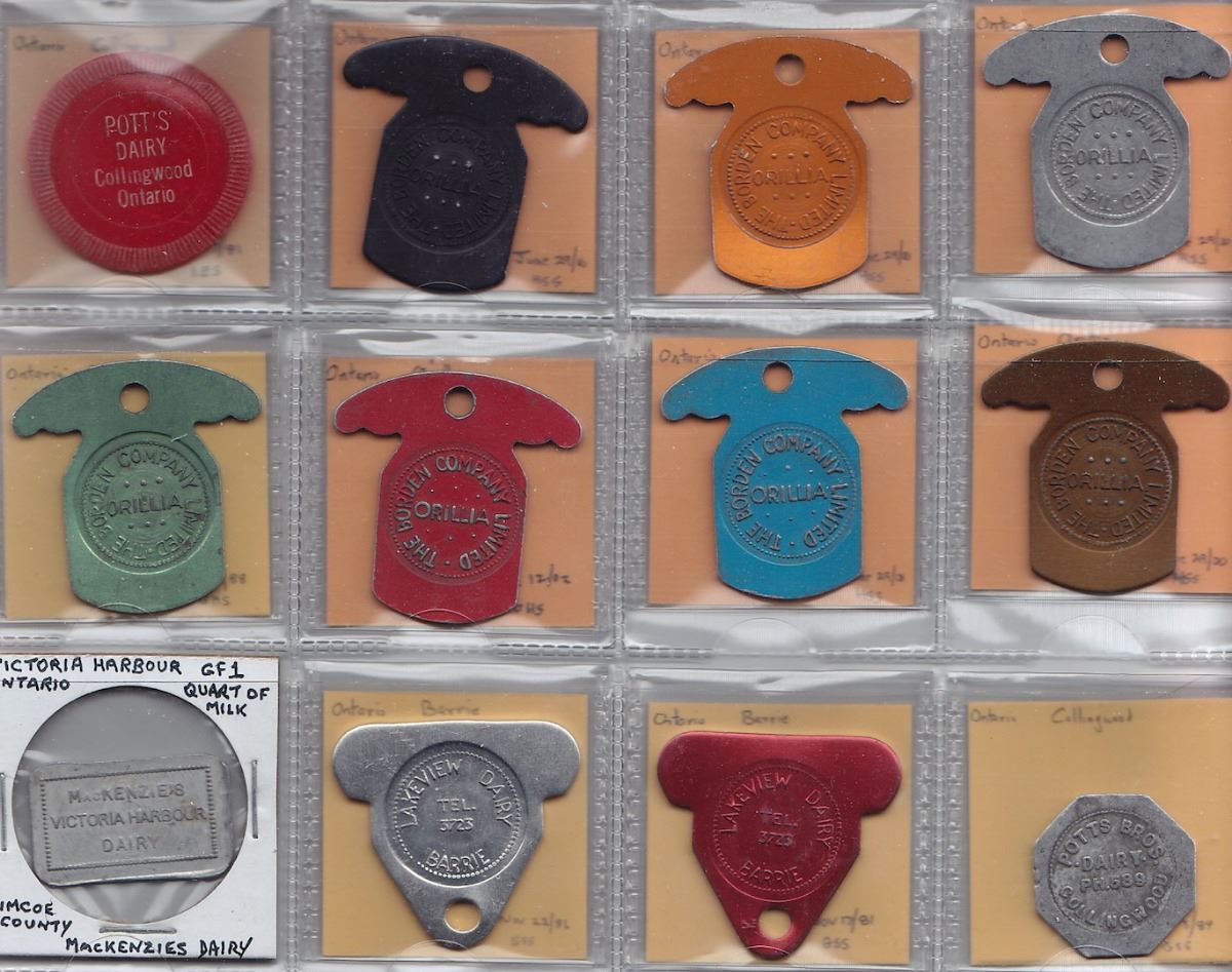 Includes: Lakeview Dairy Barrie (silver) 1 quart; (red) 5 quarts; Potts Bros. Collingwood 1 quart; Pott's Dairy Collingwood (red) skimmed 1 quart; Borden Company Orillia (black) 1/2 pint 18% cream; (gold) 1 pint; (Al) 1 quart; (green) 1 quart skim; (red) 2 quart homo; (blue) 2 quart 2% homo; (bronze) one 3 qt jug homo; MacKenzie's Victoria Harbour 1 quart. F to EF. 12 Pcs.