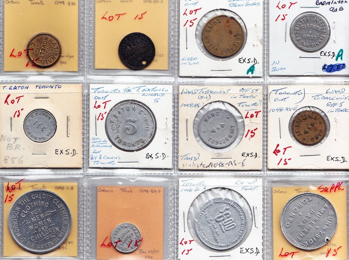 Includes: Bo 1048-Q-Ex, National Novelty Co., Toronto, rev: G/F 5; Bo 1048-BH-A, Guinane Bros. Toronto, No. 134, uniface, holed; Bo Suppl., Beverley Steam Baths, Toronto, biface; Bo Suppl., Indoor Tennis and Badminton Club Toronto, biface; The T. Eaton Co. Ltd. Toronto, ELC, rev: 1 ; similar to previous, both obv. and rev. show a value 5; Bo 1048-AS-(E), Ward Tobaconist, Toronto, rev: G/F 5c, alum.; as previous, brass, different rev. die, value 5 ; Bo 1048-O-A, D. Morrison The Credit Clothier, Toronto, rev: $1.00 on Purchase Ten Dollars or Over; Bo 1048-BA-F, Shapiro's Drugs, Toronto, rev: 2 1/2 c; Bo 1048-BE-A, Co-Op Fertilizers, Toronto, rev: $6.00 on a Ton; Bo Suppl., Sunnyside Amusement Park Toronto, rev: Derby Winner. VF to EF. 12 Pcs.
