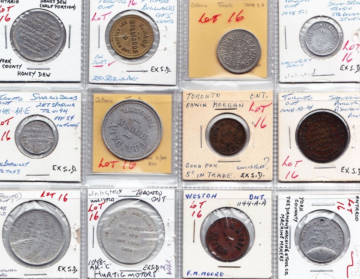 Includes: HONEY DEW, Toronto, rev: G/F 5c on Glass; Bo Suppl., F. Wade Billiards, Toronto, rev: G/F 5 Cents; Bo 1048-S-A, Noble's Amusement Arcades Toronto, biface; Bo 1048-T-(E), Hurwich Drug Store, Toronto, rev: G/F 5c; Bo 1048-AA-E, Shapiro's Drugs, Toronto, rev: G/F 5c; Bo Suppl., The Daly House Toronto, rev: 35c; Bo unl., Edwin Morgan Toronto, rev: G/F 5c ; Bo 1048-AD-Ay, Smirlies Shoe Shine Parlors, Toronto, rev: 4 Checks for 25c 17 Stores; Bo 1048-AF-D, Telegram Want Ads, Toronto, rev: G/F 25c ; Bo 1048-AK-C, Hurtig Motors, Toronto, rev: Worth $50 on Any Car; Bo 1144-A-A, F.M. Moore Weston (Toronto), rev: G/F 3 Cigars; Ler995j, The Diamond Machine & Tool Co., Toronto, rev: The Diamond Wheel & Parts. VF to EF. 12 Pcs.