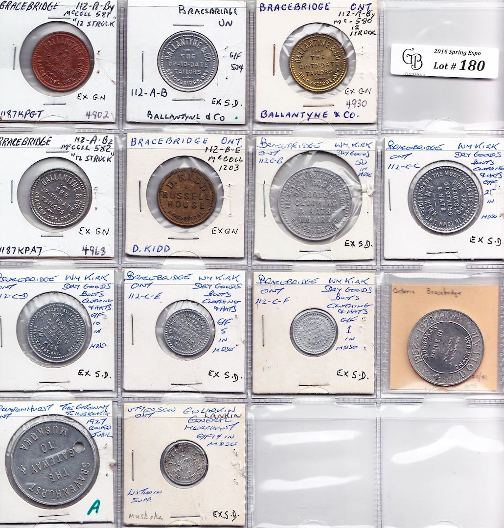 Includes: Mc 579 Ballantyne Bracebridge rev: 50c; Mc 580 12 struck as previous; Mc 581 12 struck as previous; Mc 582 12 struck as previous; Bo 112-B-E D. Kidd Bracebridge Rev: 5 cents; Bo 112-C-B to C-F Wm Kirk Bracebridge Rev: 50, 25, 10, 5 and 1; Muskoka's Drive In snack bar; Gravenhurst gateway to Muskoka Rev: 1867 Canada 1927; G.W. Lankin Utterson Rev: 1c. VG to EF. 13 Pcs.