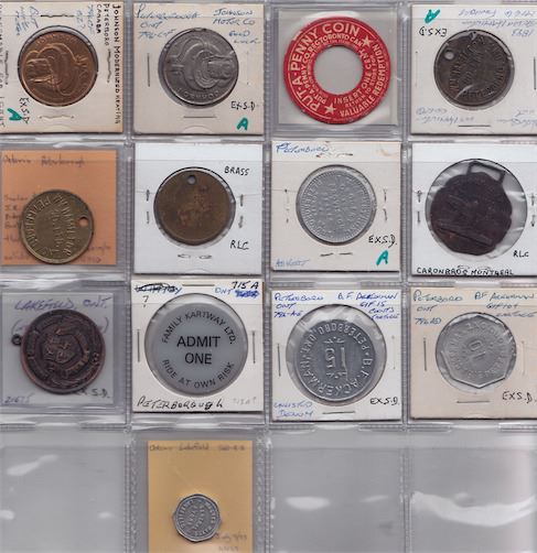 Includes: Bo 560-A-E Walter Bates Lakefield Rev: 5c; Bo 796-A-D B.F. Ackerman Peterboro Rev: 10 cents; as previous Rev: 15 cents unlisted; Bo 796-C-F Johnson Heating Rev: Good luck one cent; as previous but silver washed; E.F. Mason Peterborough Rev: put a penny; Wm Hamilton Peterboro Rev: 48; as previous Rev: 99; as previous Rev: etched outline of a head; Mc 99 J.M. Armstrong Rev: Canadian Shield; Moore's No. 13 lift lock Peterboro fob; Lakefield School medal; Family Kartway admit one. F to EF. 13 Pcs.