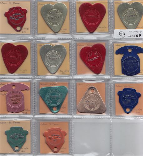 Includes: Aylmer Dairy route 1 (light green) 1 quart pasteurized; (red) 1 quart homo; Aylmer Dairy route 2 (light green) 1 quart pasteurized; (red) 1 quart homo; Aylmer Dairy route 3 (light green) 1 quart pasteurized; (red) 1 quart homo; Aylmer Dairy Ltd. (blue) 1 pint; (mauve) one 3 qt jug homo; Jas. Glover's Dairy (light blue) 1 standard quart; (light gold) 1 homo quart; St Thomas City Dairy (blue) 1 quart standard; (green) 1 quart homo; (bronze) 1 quart jersey; (red) non1fat quart. F to EF. 14 Pcs.