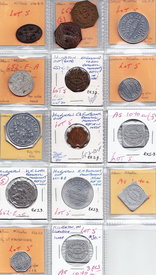 Includes: Bo 648-B-E, Millbank, Irving McVittie 5c; Milverton, Bo 652-F-A Good For One/Load/OfGravel/Milverton/Corporation, uniface; Bo 652-E-A,C,E, Milverton, W.K. Loth $1,25c,5c; Bo 652-C-C ,D, Milverton, Engeland & Son 25c, 10c; 652-D-F, Milverton, C.A. Finkbeiner 1c; Bo 652-B-B, Milverton, E.H. Dierlamm 50; As 1040a, Milverton, G. Guenther 1 Loaf (3); Bo 652-A-A, Milverton, D John Brunner & Son $1, 10c. F to EF. 15 Pcs.