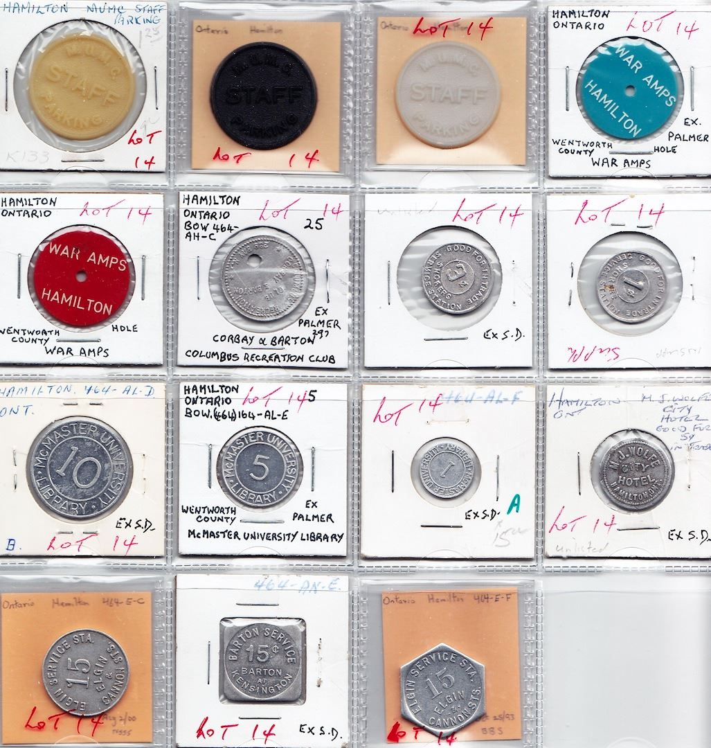 Includes: Bo Supl., MUMC (McMaster University Medical Centre) Staff Parking, Hamilton, 3 Pcs. yellow, black, and white, plastic; War Amps Hamilton, 2 Pcs. Red and blue, plastic; Bo 464-AH-C, Columbus Recreation Club, Hamilton, rev: 25, holed; Bo Suppl., Shorer's Service Station Good For 1c in Trade, Hamilton, uniface; Bo Suppl., as previous, 3c; Bo 464-AL-D, E,F, McMaster University Library 10, 5, and 1, Hamilton; Bo unl., M.J. Wolfe, City Hotel, Hamilton, rev: 5c in trade; Bo 464-E-C, Elgin Service Sta 15 Elgin & Cannon Sts., Hamilton, round, rev: H. Barnard; Bo 464-E-F, as previous, six-sided, rev: A.C. Gibson; Bo 464-AN-E, Barton Service 15c, Hamilton. VF-EF. 15 Pcs.