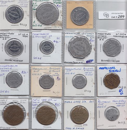 Includes: Bo 605-A-A to A-E George McKnight Magnetawan Rev: $1, 50c, 25c, 10c and 5c; Bo 605-B-A to B-E Blezard & Troyer Magnetawan Rev: $1, 50c, 25c, 10 cents and 5c; Bo 616-A-C Shepard Lumber Co. Maple Lake Station Rev: 25; Thos. W. Sword Maple Lake Station Rev: $1, 50c and 25c in 1982 supp; Bo 828-B-E Trenouth Bros. & Bone Powassan Rev: 5. G to EF. 15 Pcs.