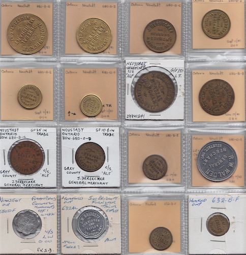 Includes: Bo 632-A-C J.W. Bridget Rev: 25c on a $5; Bo 632-B-E B-F Sewell's Meaford Rev: 5c and 1c; Bo 680-A-A to A-F J. Derbecker Neustadt Rev: 1.oo, 50, 25, 10c, 5c and 1c; Bo 680-B-A to B-E J. Derbecker Rev: 1.oo, 50, 25, 10c, 5c (c/s ALF); Bo 680-C-A R.W. Walden Neustadt Rev: 2.oo; Rahn Bros. Neustadt Rev 1 with c/s L W OOO. VG to EF. 16 Pcs.