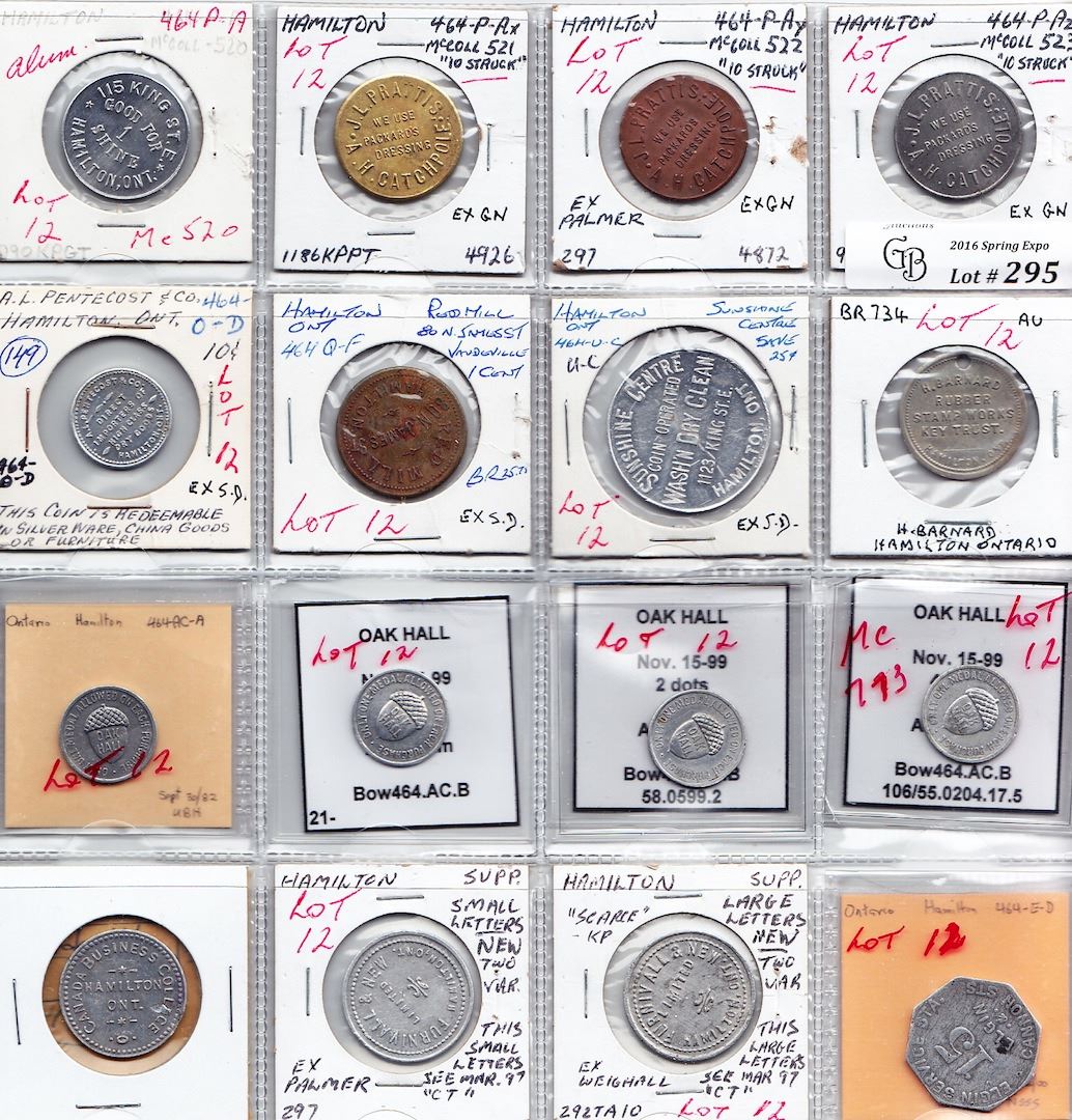 Includes: Mc 520, Bo 464-P-A, Prattis & Catchpole, Hamilton, rev:1 Shine, Al.; Mc 521, Bo 464-P-Ax, as previous, brass, 10 struck; Mc 522, Bo 464-P-Ay, as previous, copper, 10 struck; Mc 523, Bo 464-P-Az, as previous, white metal, 10 struck; Bo 464-O-D, A.L. Pentecost, Hamilton, 10c; Bo 464-Q-F, Red Mill, Hamilton, rev: Vaudeville 1 Cent; Bo 464-U-C, Sunshine Centre, Hamilton, rev: Save 25c; Br 734, H. Barnard Rubber Stamp Works, Hamilton, rev: Return and Get One Dollar, holed as made; Bo 464-AC-A, Oak Hall,rev: Good for 25c before Oct. 15, 99 no dots; Bo 464-AC-B, as previous but Nov.15, 99, 3 Pcs. with no dots, 2 dots and 4 dots; Bo 464-AG-F, Canada Business College, Hamilton, 1c ; Bo Suppl., Furnivall & New, Hamilton, rev: Good For 1/2 Crate, 2 Pcs. one small letters and one large letters, K. Palmer notes large is scarce; Bo 464-E-D, Elgin Service 15, Hamilton, uniface. VF-AU. 16 Pcs.