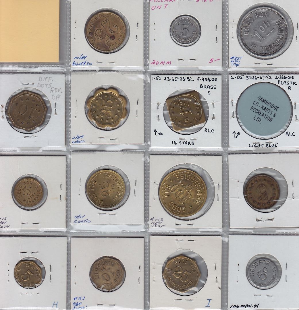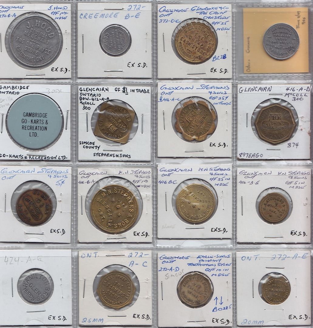 Includes: Bo 272-A-C to A-E Earle-Sykes Creemore Rev: 25, 10 and 5; Bo 272-B-a B-E J. Hood Creemore Rev: 1.oo and 5; Bo 272-C-C G. Lawrence Creemore Rev: 25; Bo 272-D G.H. Kimbar Creemore Rev: clasped hands; At 300A Gambridge Go-Karts; Bo 416-A-A A-C to A-E Stephens Glencairn Rev: $1, 25, 10 and 5; Bo 416 -B-A B-C B-E M.N. Stephens Glencairn Rev: 1.oo, 25 and 5; Bo 424-A-E Hamilton Bros. Glen Huron Rev: 5c. F to EF. 16 Pcs.