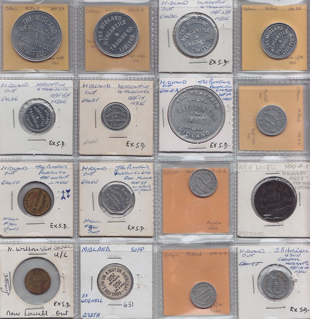 Includes: Archer & Dodds Midland Rev: $1 on suit 25c pants hat in 1982 suppl; Bo 640-C-F J.B. Horrell Midland Rev: 1c; as previous but different die Rev: 1c; Bo 640-D-A to D-F Midland Mercantile & Trading Rev: $1, 50c, 25c, 10c, 5c and 1c; Bo 640-E-A E-E Preston Co Midland Rev: 1.oo and 5; Bo 640-F-F Preston Co Midland Rev: one cent; Bo 640-G-E Preston Co Midland Rev: 5c on a pair; Bo 640-I-E A.A. Osborne Midland Rev: 5 cents; J. Lund New Lowell Rev: 25c; N. Wilson New Lowell Rev: 1c. F to EF. 16 Pcs.
