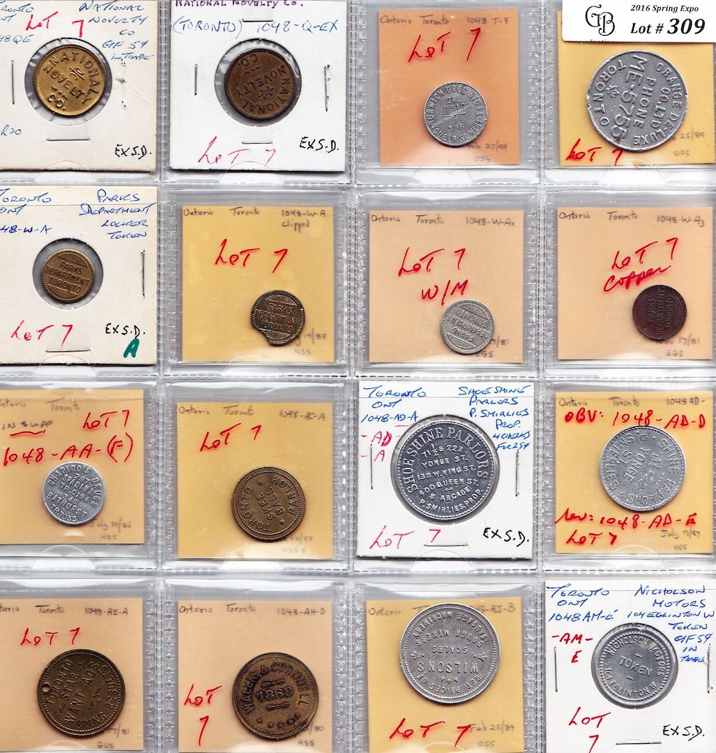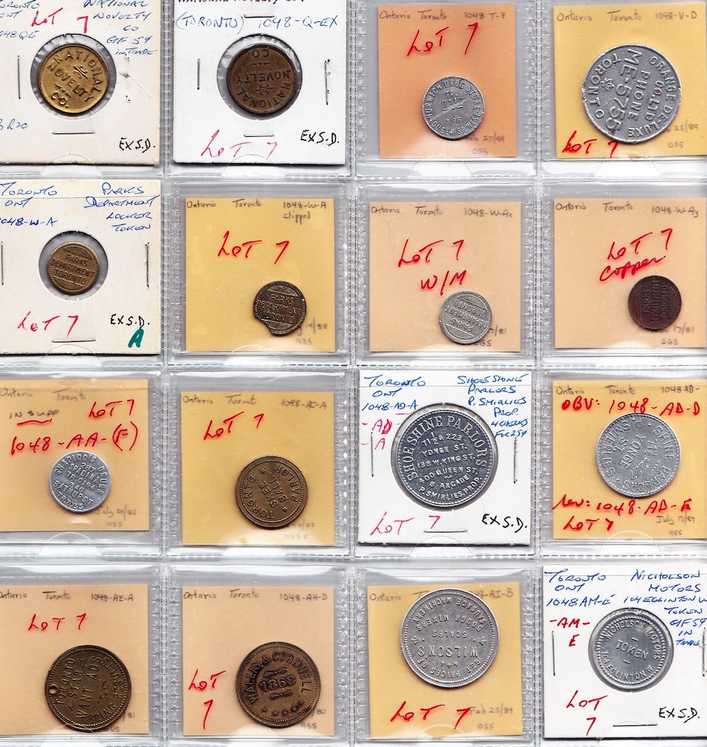 Includes: Bo 1048-Q-E, National Novelty, Toronto, rev: 5c, brass; Bo 1048-Q-Ex, as previous, copper; Bo 1048-T-F, Hurwich Drug Store, Toronto, rev: 2 1/2 c; Bo 1048-V-D, Orange De-Luxe Co. Toronto, rev: 10 Checks for One Case Orange; Bo 1048-W-A, Parks Dept. Toronto Locker Token and one clipped , 2 Pcs., 1048-W-Ax and Ay, as previous in white metal and copper, 2pcs., Bo 1048-AA-(F), Shapiro's Drugs, Toronto, rev: 2 1/2c; Bo 1048-AC-A, Toronto Skee Ball Parlor, biface; Bo 1048-AD-A, Smirlies Shoe Shine Parlor, Toronto, rev: 4 Checks for 25c; Bo 1048-AD-D obverse with Bo 1048-AD-E reverse, Smirlies , Toronto, rev: 3 Polish for 25c; Bo 1048-AE-A, Toronto Star Want Ads,rev: good luck horseshoe, brass, holed; Bo 1048-AH-D, Wallis & Cornnell, Toronto, 1868, rev: One Bag Grains 20c, brass; Bo 1048-AI-B, Wilson's Scales, rev: 50c on $5; Bo 1048-AM-E, Nicholson Motors, Toronto, rev: 5c. VF to EF. 16 Pcs.