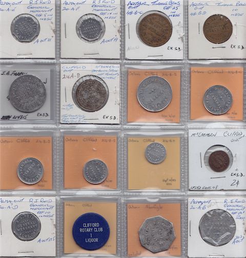 Includes: A.B. Falconbridge Aberfoyle Rev: 50 unlisted; Bo 20-A-B A-D to A-F R.J. Reid Alma Rev: 50c, 10, 5 and 1c; Bo 48-B-C B-D Tindale Bros. Arthur Rev: 25 and 10; J.A. Farrell Arthur Rev: 50c; Bo 216-A-D Smith & Sons Clifford Rev: 10c; Bo 216-B-B to B-F D. McEachern Clifford Rev: 50, 25, 10, 5 and 1; as previous Rev: 2; Clifford Rotary Club. VG to EF. 16 Pcs.