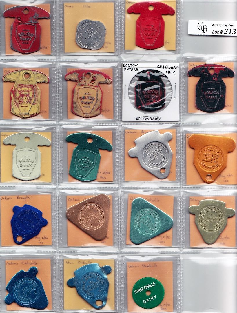 Includes: As 0035a MacQuarrie Alton 1/2 loaf; Bolton Dairy (red) 1 quart; as previous but c/s S on obverse and reverse; (red) 1 quart painted yellow; as previous but c/s 2 on obverse and reverse; (red) 1 quart painted black; as previous but c/s S on obverse and reverse; (light yellow) 1 quart 2%; (green) 1 quart skim; Pocock Brampton 1 quart pasteurized; (bronze) 1 quart jersey; (blue) 1 quart homo; Cooksville Jersey Dairy (gold) 1 quart; (green) 1 quart; (light green) 1 quart skim; (blue) 1 quart; (blue) 1 quart jersey; Streetsville Dairy (green) 5 cents. VF to EF. 18 Pcs.