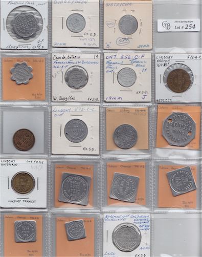 Includes: D. Cain Bobcaygeon Rev: 5; Frank Read Bobcaygeon Rev: 5 cents in 1982 suppl; 356-A-C A-E A-F W. Burgoyne Fenelon Falls Rev: 25, 5 and 1c; 356-C-F Terrill Bros Fenelon Falls Rev: 1c; 572-A-C T. Mc Connell Royal Hotel Lindsay Rev: 5 cents; 572-A-E TMC 5c uniface; 572-C-C W.F. Mc Carty Lindsay Rev: 25c; similar to previous but different dies unlisted; Pym's Hotel Lindsay Rev: one meal; At 495A Lindsay Transit one fare; 740-A-A to A-E Charles Ivory Omemee Rev: $1, 50c, 25c, 10c and 5c; Jas. Dobson Omemee Rev: 50c. F to EF. 18 Pcs.