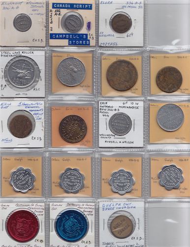 Includes: Bo 336-A-E to A-G Campbell's Elora Rev: 5, 2 and 1; T.E. Bissell Elora ad token; as previous but different die; T.J. Hamilton Erin Rev: $1, 25c and 10c; Bo 344-B-A B-D Russell & Nelson Erin Rev: 1.oo and 10; Bo 452-A-B F. Hurndall Guelph Rev: 50c; Bo 452-B-E to B-H Kandy Kitchen Rev: 20, 15, 10 and 5; (red) 1874-1974 Agricultural College; (blue) as previous; Guelph space invasion. F to EF. 18 Pcs.